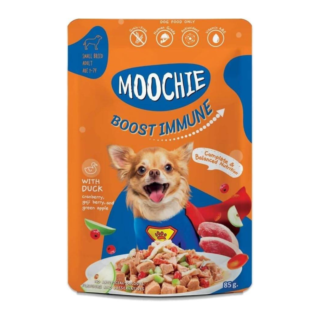 - FLAVOURFUL: Indulge your dog in the irresistible flavour of Boost Immune made with Duck Meat, Cranberries, Goji Berries and Green Apples which is specially formulated to promote special digestive care, healthy growth and development. This delectable option from Moochie Wet Dog Food is packed with essential nutrients, vitamins, and protein, ensuring that your beloved dogs receive the nutrition they require for strong growth and vitality.