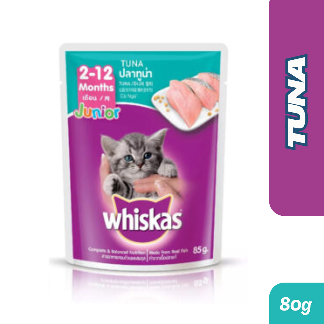 Whiskas Pouch Junior Tuna Pouch is Specially formulated for Kittens aged below 1 year old. Formulated with omega 3 & 6 fats and zinc for a healthy and shiny coat. Complete with vitamin A and Taurine for healthy eyesight. Filled with proteins from real fish, including fats, vitamins and minerals, so your Kitten stays fit and happy. Contains antioxidants (vitamin E and selenium) for a healthy immune system.